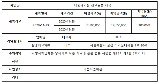 2020년 11월 수의계약 내역 공개(대형폐기물 신고필증 제작)