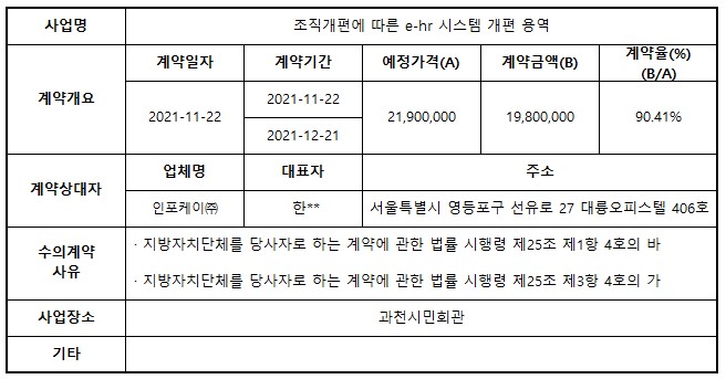 2021년 11월 수의계약 내역 공개(조직개편에 따른 e-hr 시스템 개편 용역)