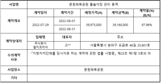 2022년 7월 수의계약 내역 공개(문원체육공원 물놀이장 관리 용역)