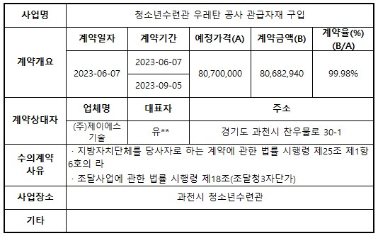 2023년 6월 수의계약 내역 공개(청소년수련관 우레탄 공사 관급자재 구입)