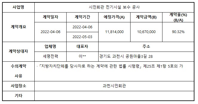 2022년 4월 수의계약 내역 공개(시민회관 전기시설 보수 공사)