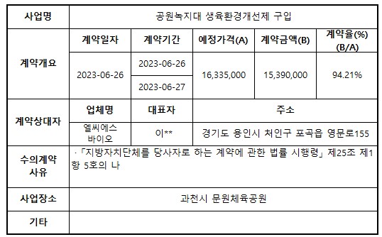 2023년 6월 수의계약 내역 공개(공원녹지대 생육환경개선제 구입)