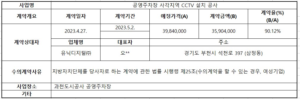 2023년 4월 수의계약 내역공개(공영주차장 사각지역 CCTV 설치 공사)