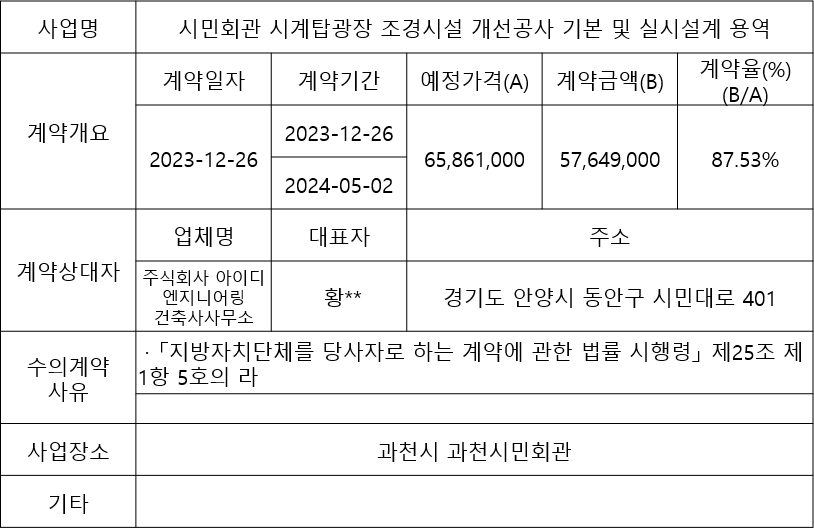 2023년 12월 수의계약 내역 공개(시민회관 시계탑광장 조경시설 개선공사 기본 및 실시설계 용역)