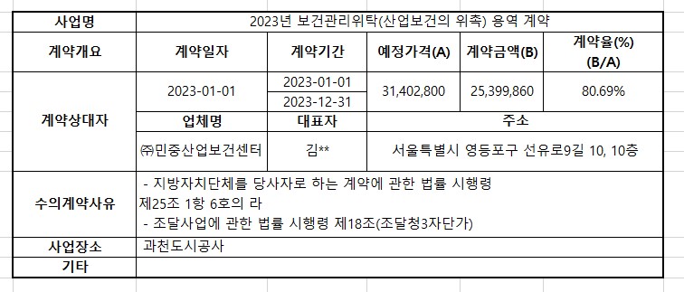 2023년 1월 수의계약 내역공개(2023년 보건관리위탁(산업보건의 위촉)용역 계약