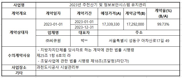 2023년 1월 수의계약 내역공개(2023년 주전산기 및 정보보안시스템 유지관리)