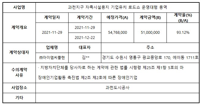2021년 11월 수의계약 내역 공개(과천지구 자족시설용지 기업유치 로드쇼 운영대행 용역)