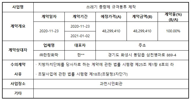2020년 11월 수의계약 내역 공개(쓰레기 종량제 규격봉투 제작)