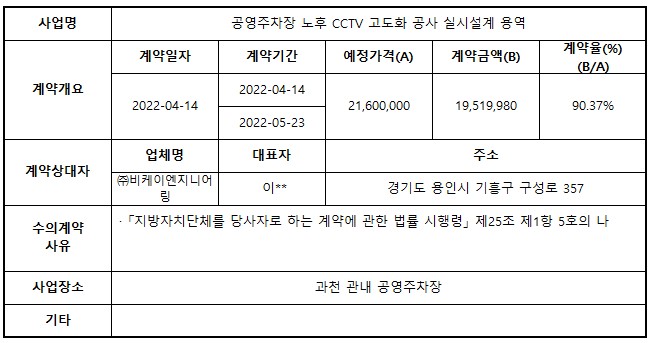 2022년 4월 수의계약 내역 공개(공영주차장 노후 CCTV 고도화 공사 실시설계 용역)