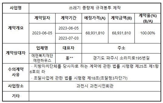 2023년 6월 수의계약 내역 공개(쓰레기 종량제 규격봉투 제작)