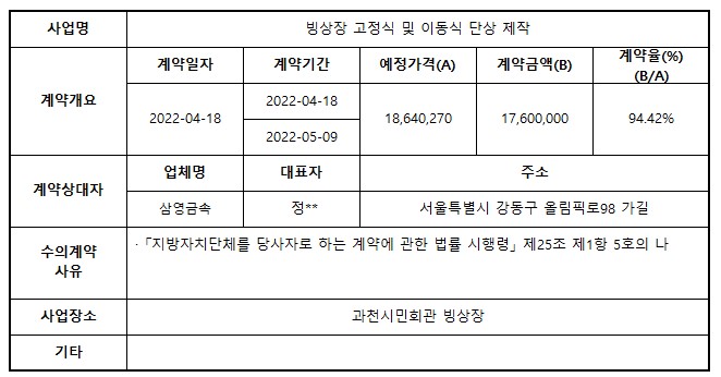 2022년 4월 수의계약 내역 공개(빙상장 고정식 및 이동식 단상 제작)
