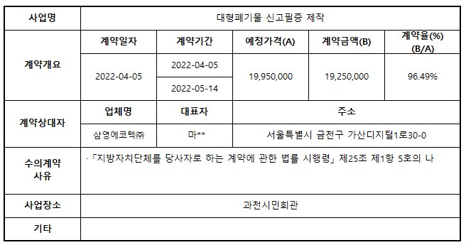 2022년 4월 수의계약 내역 공개(대형폐기물 신고필증 제작)